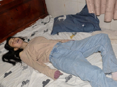 China. 36 year old sexy MILF hanged herself in the window of her apartment. Her 22 year old younger lover took all of her savings, plus convincing her to take up large amount of credit and then leaving her. Heartbroken and in large debt.